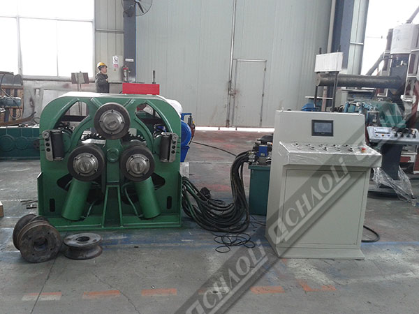 此設(shè)備為較為先進(jìn)型材彎曲設(shè)備,可做立式或臥式使用。更換模具可卷制各種型材及彎曲盤管。三輥均為主動(dòng)輥,通過液壓馬達(dá)—齒輪傳動(dòng)。設(shè)備有PLC 數(shù)控控制,帶矯正導(dǎo)向輥裝置,兩個(gè)側(cè)輥可圍繞固定回轉(zhuǎn)中心做弧線升降運(yùn)動(dòng)。