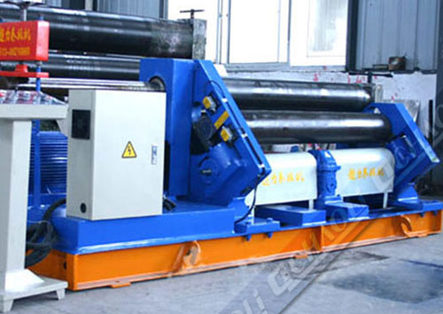 該機(jī)結(jié)構(gòu)型式為三輥非對稱式,下輥為主傳動(dòng),并做垂直升降運(yùn)動(dòng),以便夾緊板材。通過下輥齒輪與上輥齒輪嚙合,同時(shí)作為主傳動(dòng),側(cè)輥?zhàn)鲀A升降運(yùn)動(dòng)。具有預(yù)彎、卷圓多重功能,結(jié)構(gòu)緊湊操作維修方便。