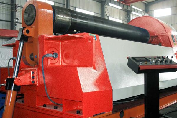 卷板機(jī)是對板料進(jìn)行連續(xù)點(diǎn)彎曲的塑形機(jī)床。卷板機(jī)上輥在兩下輥中央對稱位置通過液壓缸內(nèi)的液壓油作用于活塞作垂直升降運(yùn)動,通過主減速機(jī)的末級齒輪帶動兩下輥齒輪嚙合作旋轉(zhuǎn)運(yùn)動,為卷制板材提供扭矩。 三輥對稱卷板機(jī)主要特點(diǎn):該機(jī)上輥可以垂直升降,垂直升降的液壓傳動,通過液壓缸內(nèi)的液壓油作用活塞桿而獲得;下輥?zhàn)餍D(zhuǎn)驅(qū)動,通過減速機(jī)輸出齒輪嚙合,為卷板提供扭矩,下輥下部有托輥,并可調(diào)節(jié)。上輥呈鼓形狀,提高制品的直線度,適用于超長規(guī)格各種截面形狀罐。
